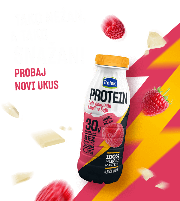 Novi Imlek Protein šejk donosi savršenu kombinaciju ukusa – bela čokolada i malina. Napravljen od 100% mlečnog proteina, bez dodatog šećera, sa niskim procentom mlečne masti i bez laktoze. Može se konzumirati nakon fizičke aktivnosti zbog oporavka mišića, ali je i odličan izbor kao kvalitetna užina.