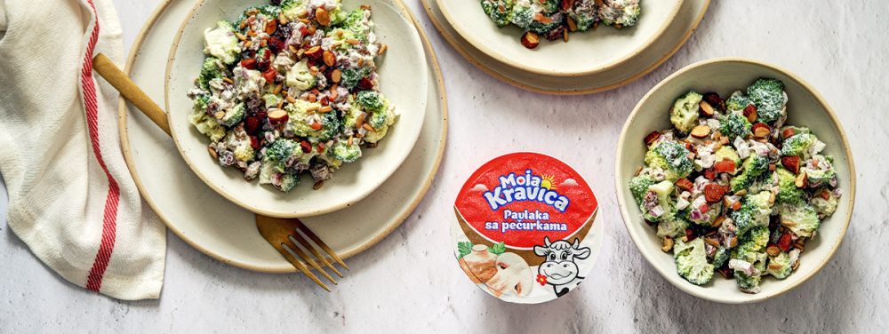 U činiju za mešanje staviti sitno seckan crveni luk, brokoli i grožđice pa preliti Moja Kravica pavlakom sa pečurkama, posoliti i pobiberiti pa sve dobro promešati i staviti u frižider na par sati.