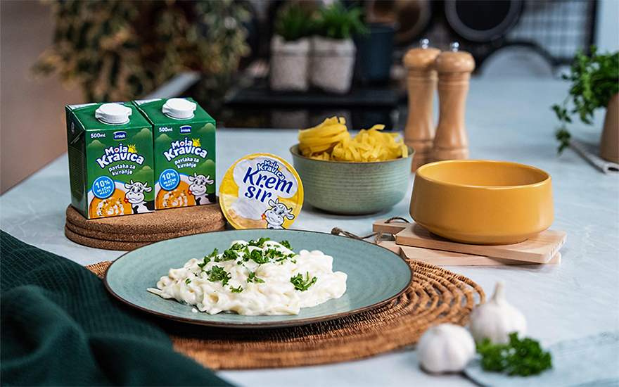 Na otopljenom puteru kratko propržite beli luk, zatim sipajte Moja Kravica pavlaku za kuvanje 10% i kratko prokuvajte.