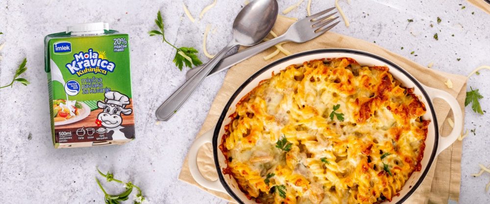 Kuvanoj testenini dodajte začinsko bilje, tunjevinu, prethodno napravljen sos i sve prebacite u tepsiju za pečenje.