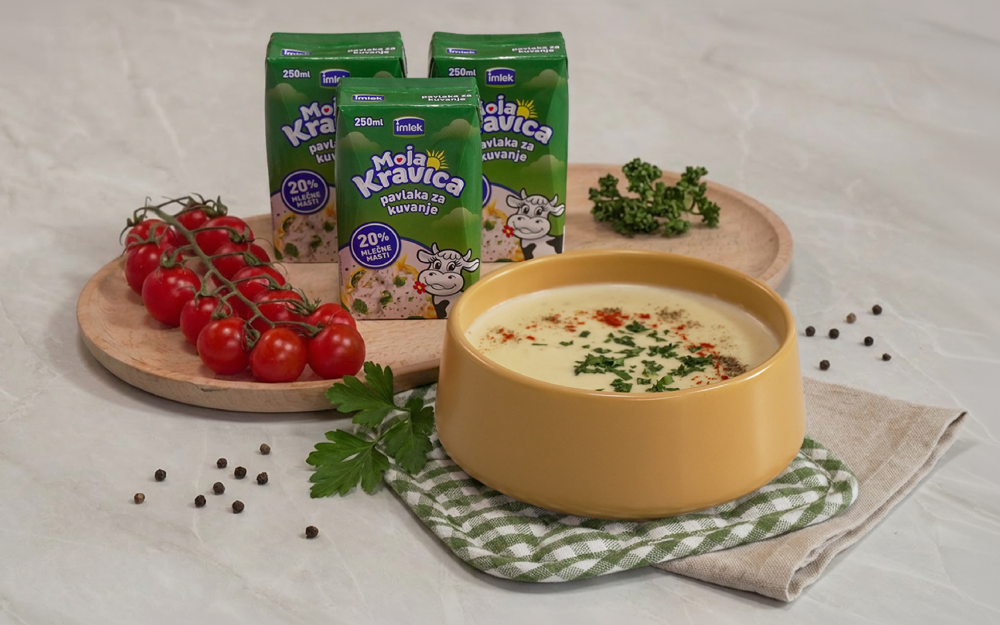 Vratiti potaž na srednju temperaturu pa dodati 250ml Moja Kravica pavlake za kuvanje. Lagano kuvati još 4–5 minuta da se sve sjedini i dobije svilenkasta tekstura.