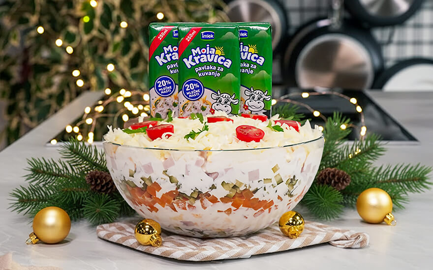 Kuvana šargarepa, šunka, sir i jaja složeni uz kremasti preliv od Moja Kravica pavlake za kuvanje i majoneza čine salatu koja izgleda svečano i miriše na domaće.