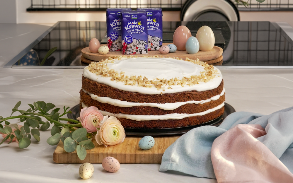 Lagano umutiti. Dodati rendanu šargarepu, a potom i orahe. Peći na 180°C oko 35 minuta. Ohladiti i preseći na 2 kore.
